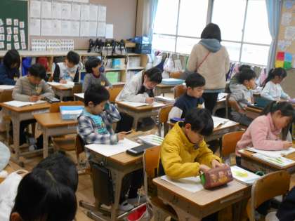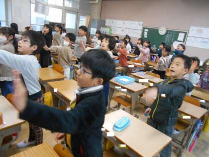 (上)6年生を送る会で披露する手話と歌の練習をしています。