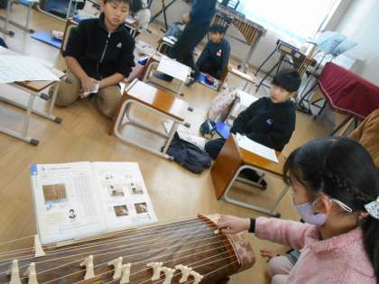 (上)音楽で「さくら さくら」の曲を琴で引いています。