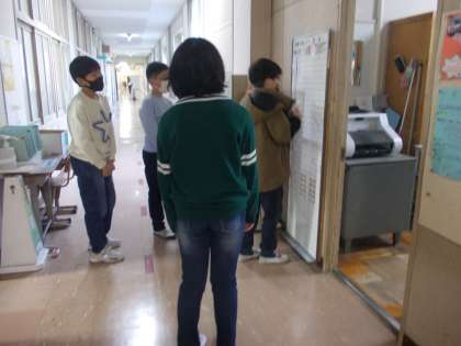 保健調べをした後、欠席人数を書きに来ている子どもたちです。このボードに記入された人数とTetoruをみて欠席状況を確認します。今日は学級閉鎖をするクラスがなくてほっとしました。