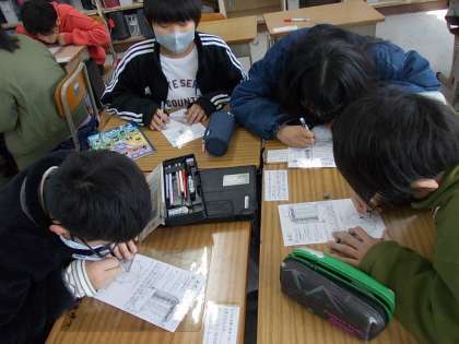 3組の算数です。帯グラフと円グラフがけるように、班で協力して教えあっています。