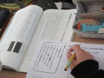 「想像力のスイッチを入れよう」で、学習のめあては「これまでにメディアと関わった経験を思い出し、メディアとの関わりについて自分の考えを書こう」です。