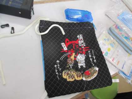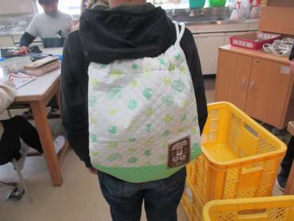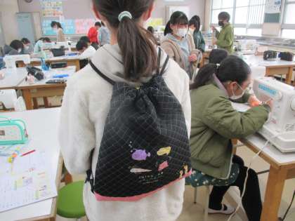 3組の家庭科です。ナップサックが完成しました。