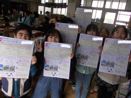 「これがわたしのお気に入り」と社会「市のようすのうつりかわり」のテストを返してもらっています。「100てんとったよ」と見せてくれました。