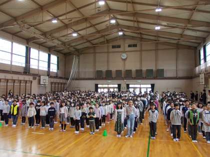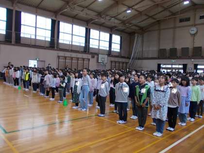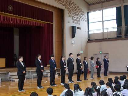 新卒の先生を「今春、大学を卒業されました。」と、紹介すると、子どもたちから大きな拍手がわきました。「卒業おめでとう。これからがんばってね。」の気持ちがこもった拍手です。気持ちがとっても温かくなりました。