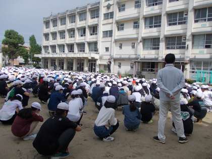 最初に生徒指導委員会の先生より、朝礼を行うときのきまりや姿勢等、朝礼指導がありました。