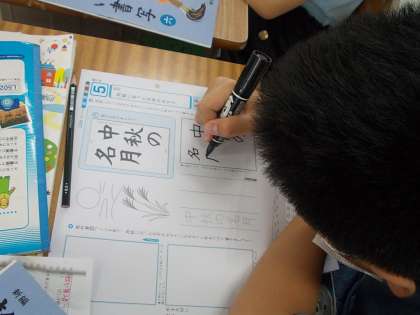 硬筆「用紙に合った文字の大きさになるように気をつけて書こう」に取り組んでいます。「中秋の名月」を書いています。