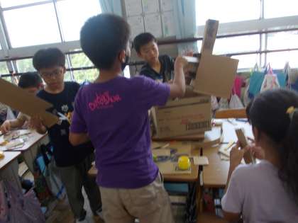 5年生の図工では、未来のまちを段ボールを使って制作していました。