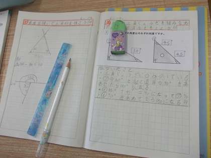 今日は、「二組の三角定規を組み合わせてできる角度を考えよう」に取り組んでいます。