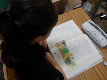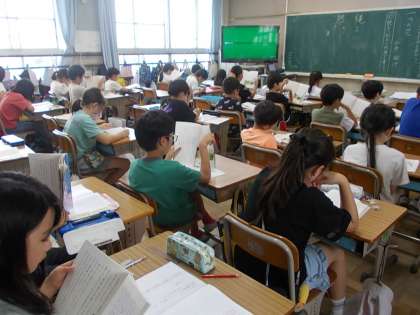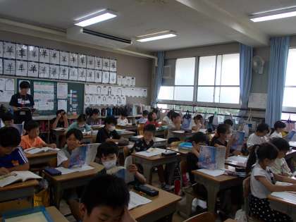 今日は、「読んで感想を書こう」に取り組んでいます。先生がお話を読んでいます。