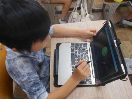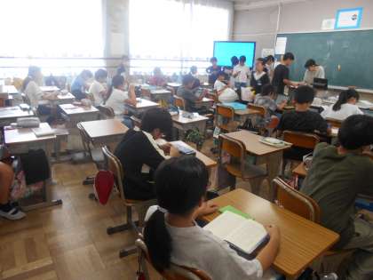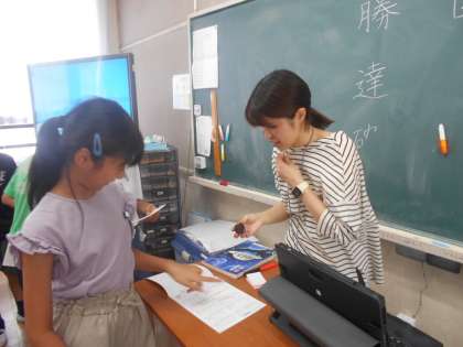 漢字の学習をしています。先生に見てもらい、全員が完成したら、そのあと、教室で「鉄棒」の技の学習を行います。