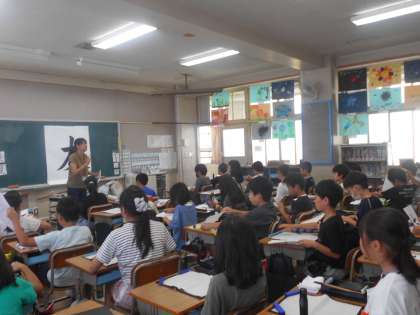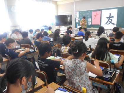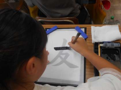 「友」に取り組みます。最初は、お手本を下に敷き、写しがきをしていました。