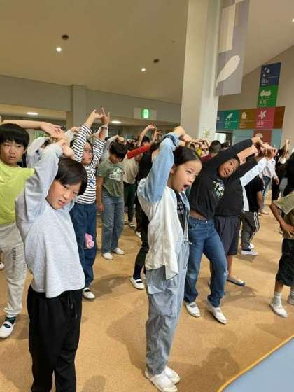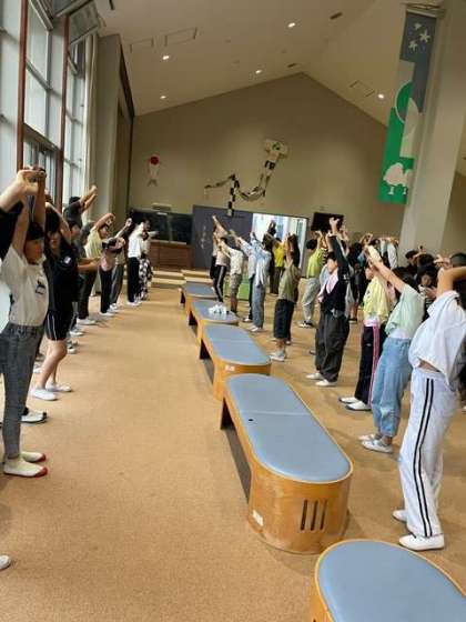 朝の集いの様子です。ストレッチをしたり、この後の予定を確認しました。