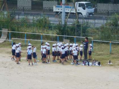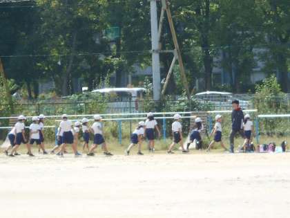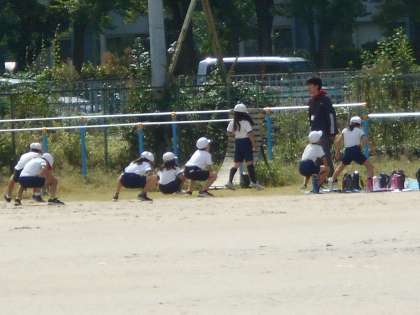 運動場で「鉄棒」に取り組みます。準備体操をしていました。