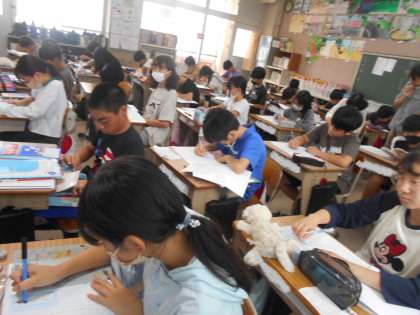 今日は硬筆です。「文と文のつながり」のシートに取り組んでいます。