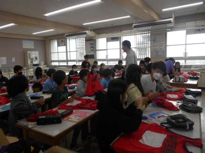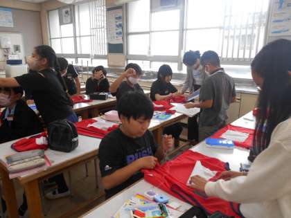 連合運動会に着用するビブスにゼッケンを縫いつけています。