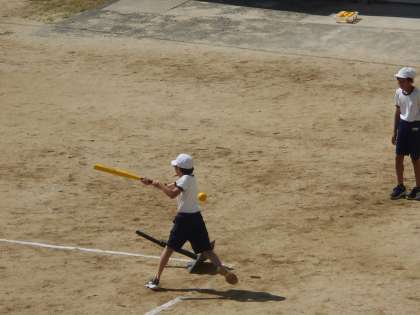 運動場でティーバッティングに取り組んでいます。