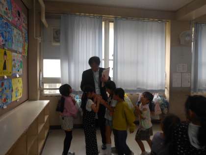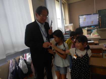 授業が終わった後、子どもたちが、専門指導員の先生の書ところに駆け寄り、「手みせて〜」「さわらせて〜」「大きいな〜」などと話しかけに言っていました。