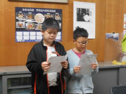 図書委員会から「読書週間とポスター掲示のお知らせ」、図書を担当する先生たちから、「ビブリオバトル」が行われました。
