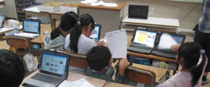 1組の総合では、自分たちが調べた内容をタブレットを使ってまとめ発表の練習をしていました。