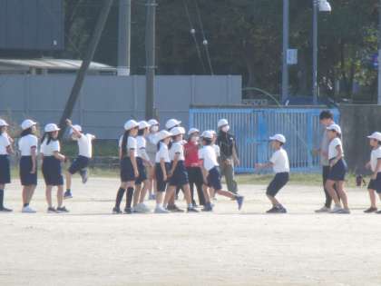 4組の体育では、長縄に取り組んでいました。かけ足も行ったりもしていて持久力がつく運動に励んでいます。