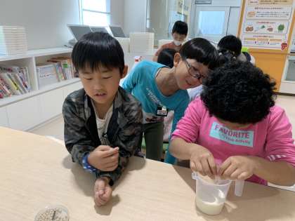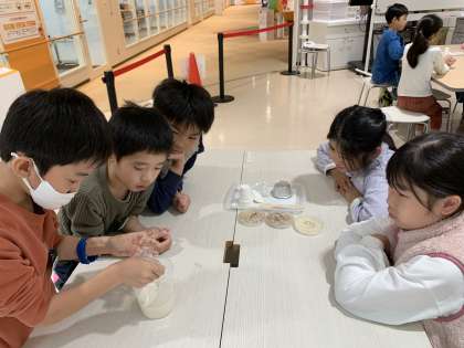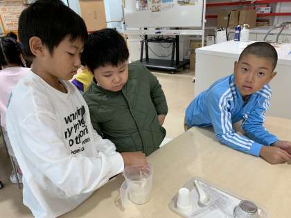豆乳ににがりを入れ、1人、10回ずつまわします。