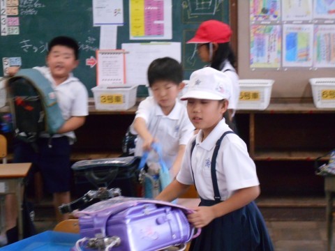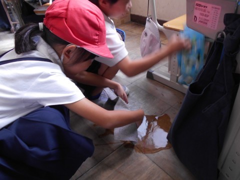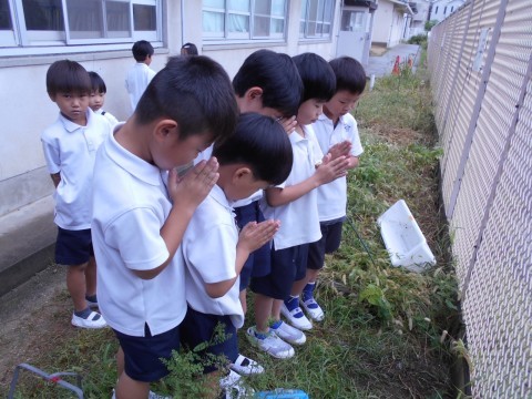 今朝はTV朝礼がありました。背筋を伸ばし静かにテレビを見て朝礼を行いました。飼育していたカエルが息絶えたので埋めに行きました。帰りの準備中に,お茶をこぼしてしまったお友だちのお茶を拭くのを手伝う優しい姿を見ることができました。「ありがとう!」