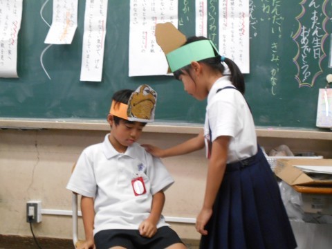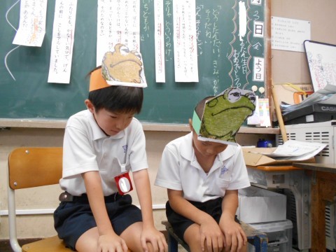 国語「お手紙」の動作化(場面の一部の劇)をしてがまくんとかえるくんの気持ちを考えました。照れながらも,なりきって表現できる児童でした。