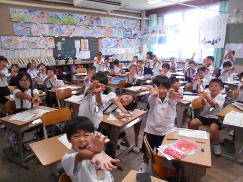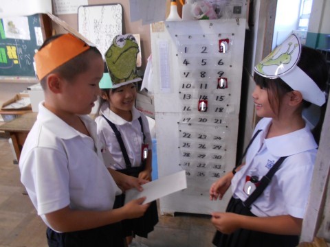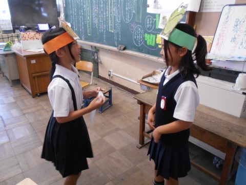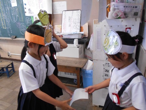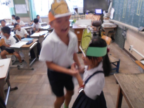 昨日からお休みの児童に元気パワーを送っているところです。「お手紙」の劇で喜び合う場面です。