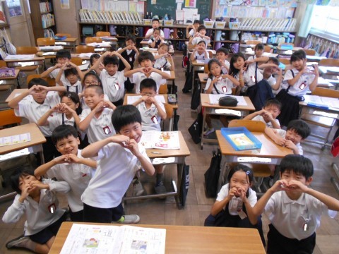 両手でハート形を作ってお休みの児童に「この愛とどけ‼」をしています。