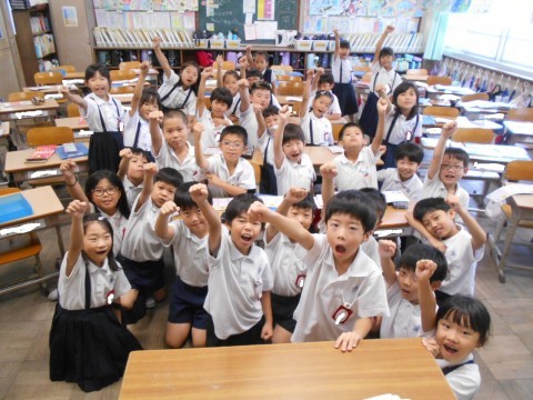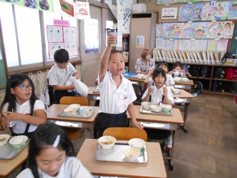 今日のお誕生日の児童を,ハッピーバースデーの歌を歌った後に乾杯してお祝いしました。朝一番の掛け声の様子です。