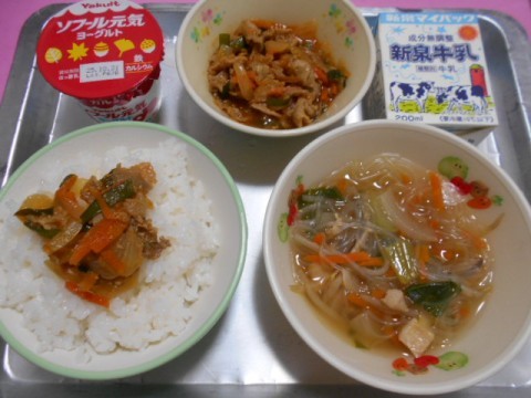 今日は春雨スープ・スタミナ丼・ヨーグルトでした。
