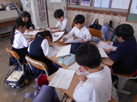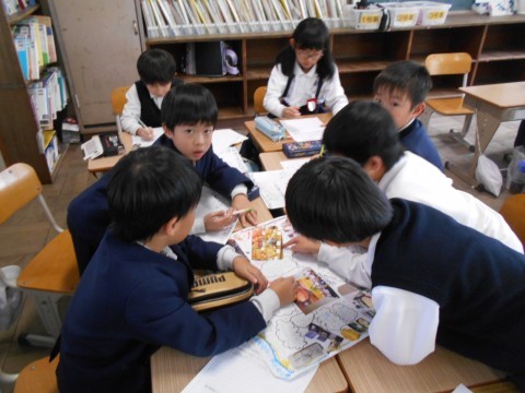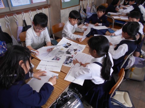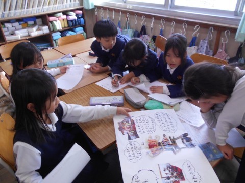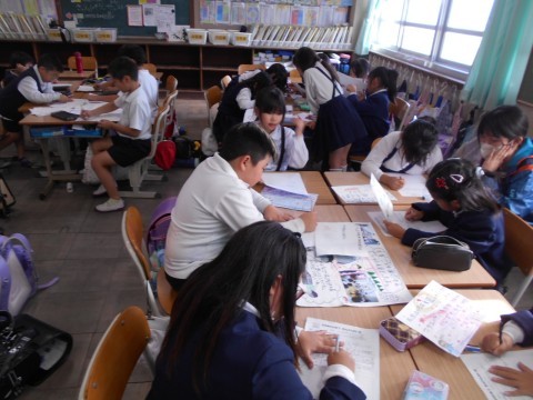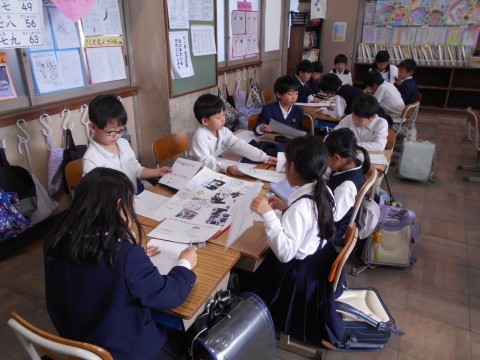 他のクラスが町たんけんをした場所をまとめた成果物を見ながら学びました。