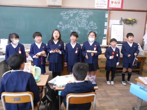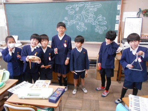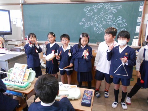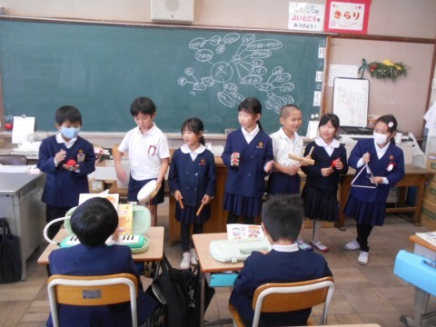 音楽の授業で「かぼちゃ」を1グループ7人でやりました。歌を歌うと同時にそれぞれ違う楽器でリズムをうちながら1人→2人→・・・→7人と順に増えていく楽しくやっていました。