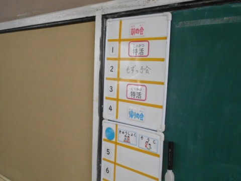また見通しをもって1日を過ごせるように時間割を示したり、ぞうきんかけに目印をつけたりするなど教室環境を整えることで、子どもたちの自主的な行動を支えていきます。