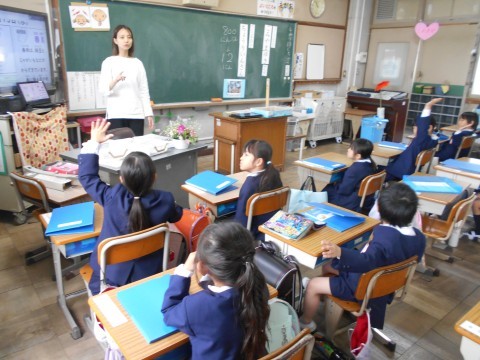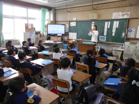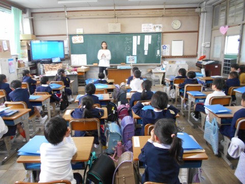 今日は1組と2組が,明日は3組と4組が二日に分けて初めての給食のやり方の説明を栄養教諭の先生から学びました。みんな真剣に聞いていました。