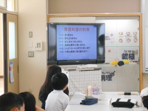 これまでのお手伝いの経験も生かして、楽しく安全に学んでいきます。今日はそのための家庭科室でのルールを確認しました。