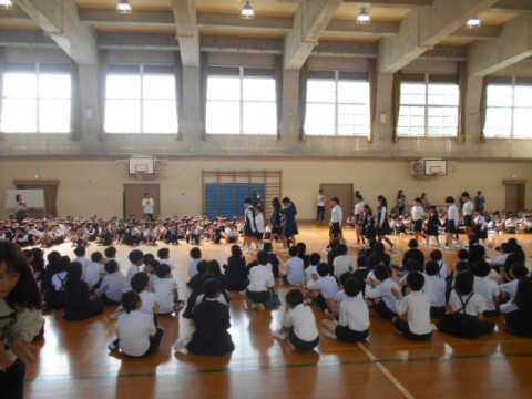 6年生のお兄さんお姉さんと手をつないで、120名の1年生が体育館に笑顔で入場してきました。