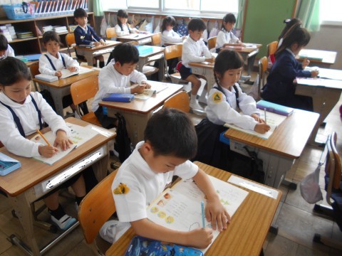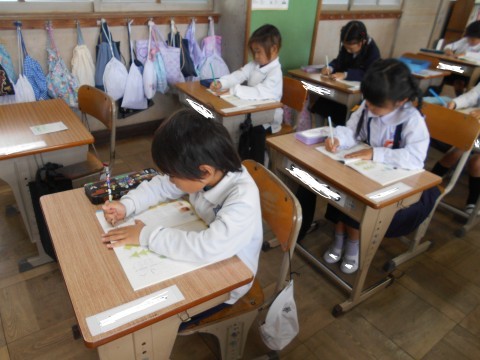鉛筆の持ち方や姿勢(グー,ペタ,ピン)に気を付けてひらがなの「お」を学習しました。