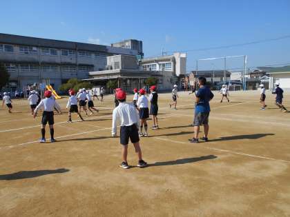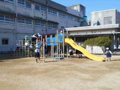 休み時間の運動場のようすです。 子どもたちは,ドッジボールや遊具で楽しそうに遊んでいます。