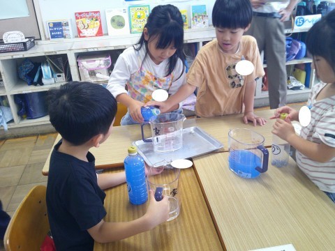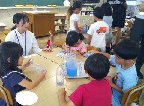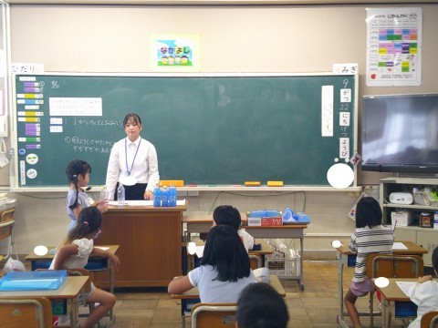 9月22日(月)1年生 公開日 2025/09/22 更新日 2025/09/22 1年生のページ 教育実習生の算数の研究授業がありました。3つの入れ物に入っている水のかさをくらべるにはどうしたらいいかくらべかたを考えた後,同じ入れ物にうつして高さをくらべていました。実際に水をうつしかえる活動することで,水のかさが視覚的にわかりやすくなっていました。