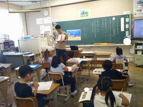 国語「うみのかくれんぼ」の学習をしていました。文章の表現に着目して動作化をしたり,場面の様子を視覚的に表したりして,内容を理解していました。