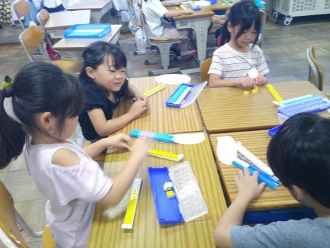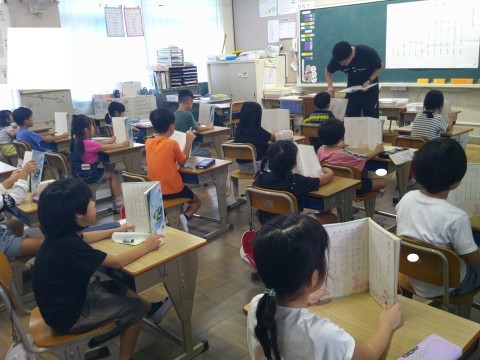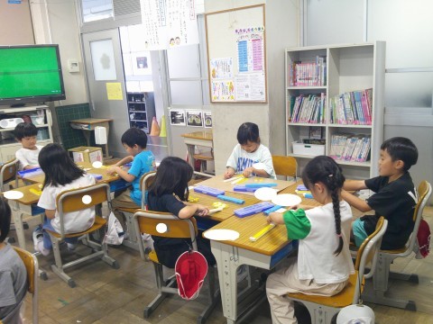 算数では,文章問題の解き方ををブロックを使って説明する学習をしていました。国語では,「かずとかんじ」の文章を音読していました。