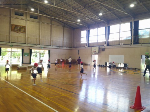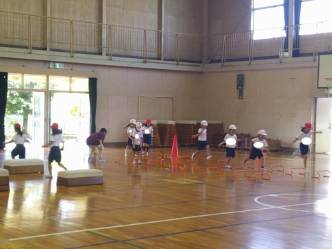 1・2組合同で,体育館で体育をしていました。ミニハードルや跳び箱をジャンプしたり,スキップや駆け足をしたりして,たくさん運動をしていました。