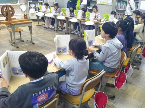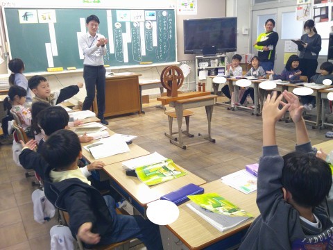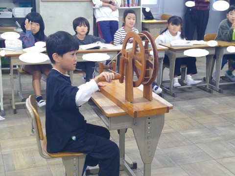 1年2組で「たぬきの糸車」の事前授業を行いました。いろいろな学年の先生方が代わる代わる参観される中,お話の世界に浸りながら集中して授業に取り組んでいました。実際に糸車をまわす体験をしながら登場人物の気持ちを想像していました。