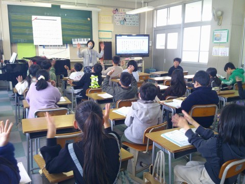 1組は,延期になったフリー参観日です。道徳では,「泣いた赤おに」を教材にして,友達を大切にするとはどういうことかについて考えを深めていました。2組の音楽では,「スーパーカリフラジリスティック」の曲を合奏する前に,手拍子でリズムの確認をしていました。「パレードホッホー」の曲では,動作をつけながら歌唱していました。