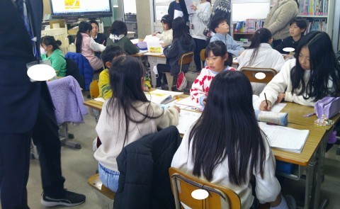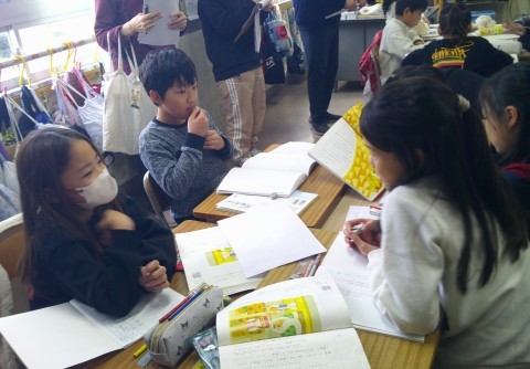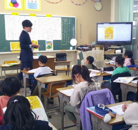 5時間目に国語「三年とうげ」の研究授業を行いました。おじいさんがどのようにかわったかについて,自分やグループで考え,全体で共有していました。キーパーソンの「トルトリ」についても想像を広げ,どんな人物かということをグループで自由に話し合っていました。多くの先生方が参観する中,とても緊張したと思いますが,みんなで読み深めることができていました。