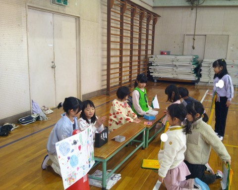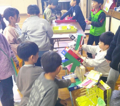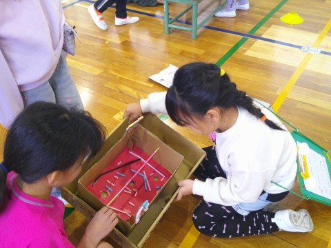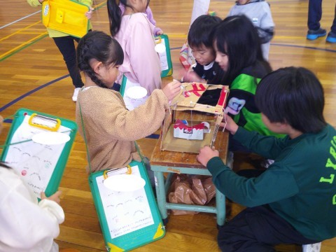 2年生が1年生を招待して,体育館で「おもちゃランド」が開かれました。まといれ・射的・迷路・ボーリング・UFOキャッチャーなど,遊びが盛りだくさん!どの場所からも,笑い声や弾んだ声が聞こえてきて,とても楽しんでいました。2年生は,ルール説明や得点方法などの遊びの運営をしっかり行い,遊び方を教えてあげて一緒に喜び合う優しい姿がありました。さすが,2年生ですね!1年生は,「わくわく広場」に向けて,2年生の姿から,たくさんのことを学ぶことができたと思います。最高の「おもちゃランド」になりました!!