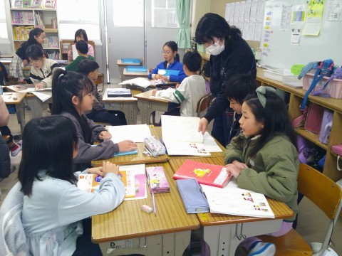 国語では,好きな詩を選び自分が面白いと思ったことをノートに書いた後,グループで交流していました。算数では,はかりを使って1㎏以上になるように重さを量っていました。