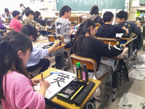 習字では,自分の目標を書いていました。お手本がないのでバランスよく書くのが難しそうでしたが,一文字一文字思いを込めて丁寧に書いていました。目標達成に向けて頑張りましょう!