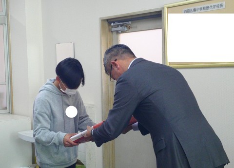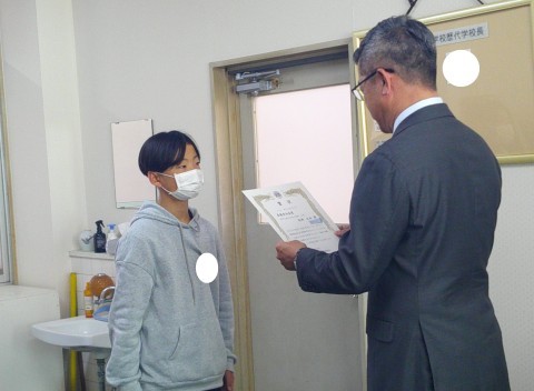 「国際平和ポスターコンテスト」の表彰を校長室で行いました。300以上の応募の中から,見事「最優秀会長賞」に選ばれたということで,ポスターコンテストを主催している堺フェニックスライオンズクラブの会長様が来校され,表彰状と記念品をお渡ししてくださいました。その様子を各教室のテレビに映し,みんなで見届けました。